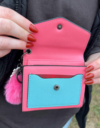 Features: Tri-fold Includes keyring with pompom Pink and Blue Snap closure Zip pocket on back Card slots