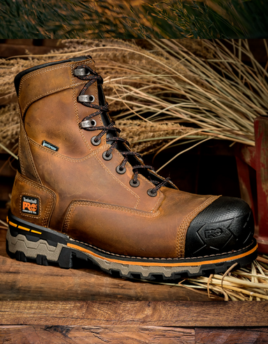 Timberland PRO Boondock work boots are waterproof and reinforced with an Ever-Guard leather heel piece and a molded rubber toe protector for abras...